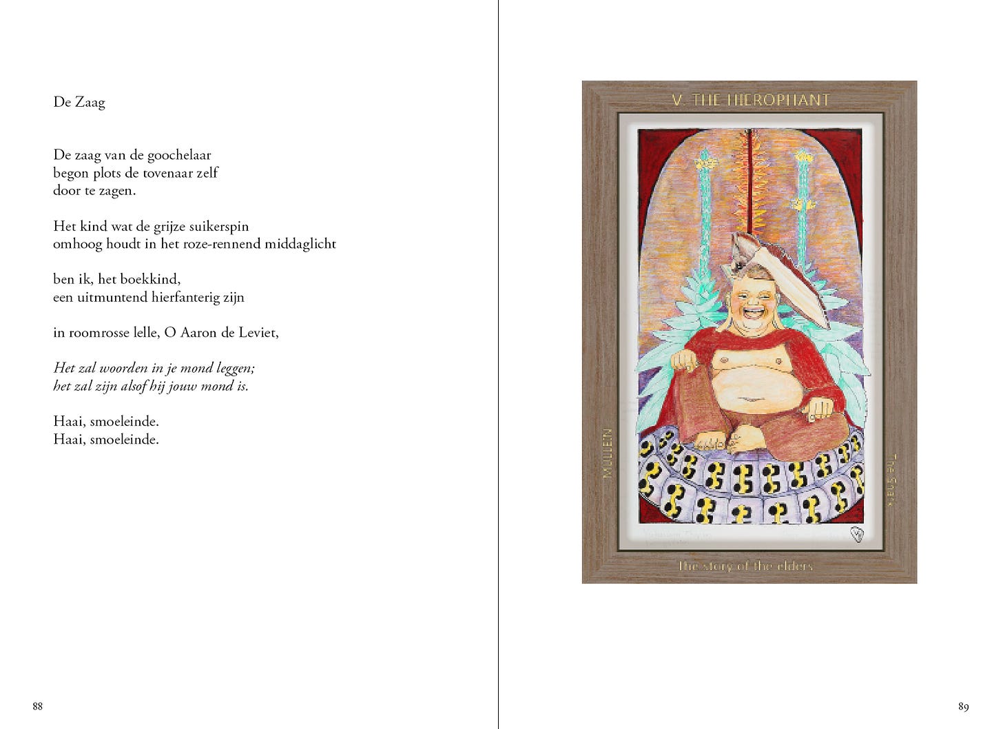De Hierofant is de archetypische leraar. De Buddha wordt doormidden gezaagd, maar hij lacht. De Aaronsroedes zijn bijna zijn vleugels. Voor de Buddha ligt iets uitgestald - zaden? Sleutels?